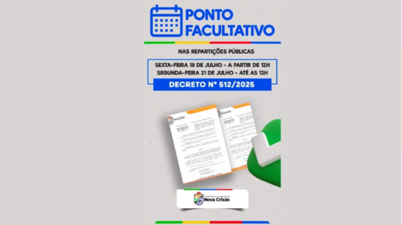 FICA DECRETADO PONTO FACULTATIVO NO ÂMBITO DA ADMINISTRAÇÃO PÚBLICA MUNICIPAL DE NOVA CRIXÁS/GO, NO PERÍODO QUE ESPECIFICA, EM RAZÃO DA TEMPORADA DE PRAIAS DO RIO ARAGUAIA.